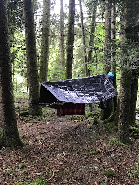"Mein Unterschlupf bestehend aus Tarp, Ästen eines Baumes und einem grossen Stein war richtig toll. - Und dann setzte ich mich hin und blickte direkt auf einen Stacheldrahtzaun! Es zeigte sich jedoch, dass er perfekt für mein Thema für das 24-h-Solo passte." Brigitte E aus Arbon
